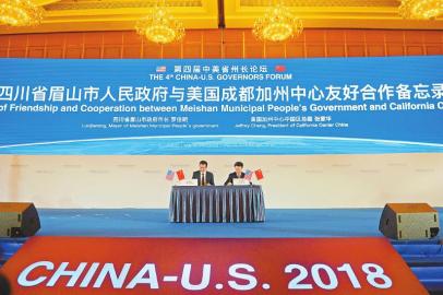 相聚 第四屆中美省州長論壇上,兩國各地嘉賓相聚成都。本版圖片由 本報記者 郝飛 攝 相約 眉山市政府與美國加州中心簽署友好合作備忘錄,相約共建眉山加州智慧小鎮。相談 中美企業代表洽談合作。