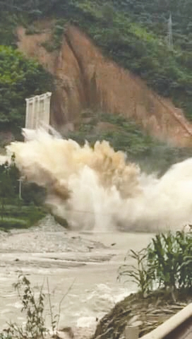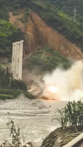 一開始,畫面中的一大片山體就開始垮塌,沖向位于河邊的六根至少10多米高的橋墩。伴隨著圍觀人群的驚呼聲,最右邊的兩個橋墩最先出現明顯的傾斜,僅僅3秒的時間,橋墩下的山體也開始垮塌,橋墩倒向河中,與此同時,中間的兩根橋墩也開始傾斜。