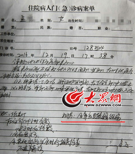 事發當天下午,孟女士到醫院急診治療的病案單。