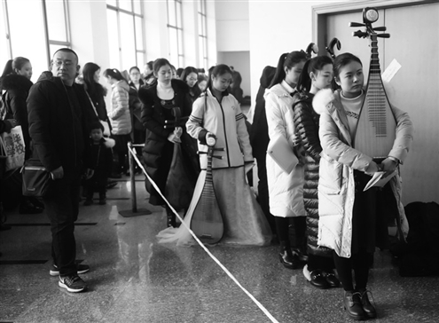 相對于美術、廣電編之類的專業,昨天的音樂表演復試現場“童子功”更多一些。不少考生從小就學樂器,十年“樂齡”不在少數。在中國樂器專業復試考場外,正在候考的東營考生朱心語就是其中一個。朱心語是六歲開始學揚琴的,“當時是媽媽給我報的興趣班,后來自己慢慢喜歡上了!彼χf自己很想當演員,但自認模樣長的不夠漂亮,所以希望通過學樂器“曲線”圓夢。