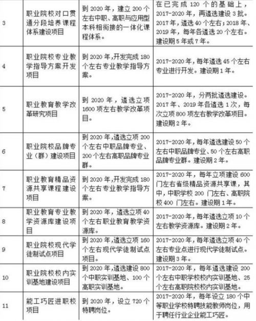 提升計劃包括六大建設(shè)內(nèi)容,17項建設(shè)任務(wù)。六大建設(shè)內(nèi)容包括加強高水平職業(yè)院校建設(shè),推進品牌專業(yè)(群)建設(shè),深化專業(yè)課程體系改革,完善產(chǎn)教深度融合校企協(xié)同育人機制,強化“雙師型”教師隊伍建設(shè),推動職業(yè)院校文化育人工作創(chuàng)新等。17項建設(shè)任務(wù)以2020年為目標(biāo)年份,提出了具體的建設(shè)目標(biāo)。根據(jù)各項目推進程度不同,建設(shè)期不等。其中,職業(yè)院校對口貫通分段培養(yǎng)課程體系建設(shè)項目建設(shè)期較長,為5年或7年;職業(yè)院校專業(yè)教學(xué)指導(dǎo)方案開發(fā)項目、職業(yè)教育精品資源共享課程建設(shè)項目則只需1年建設(shè)期。