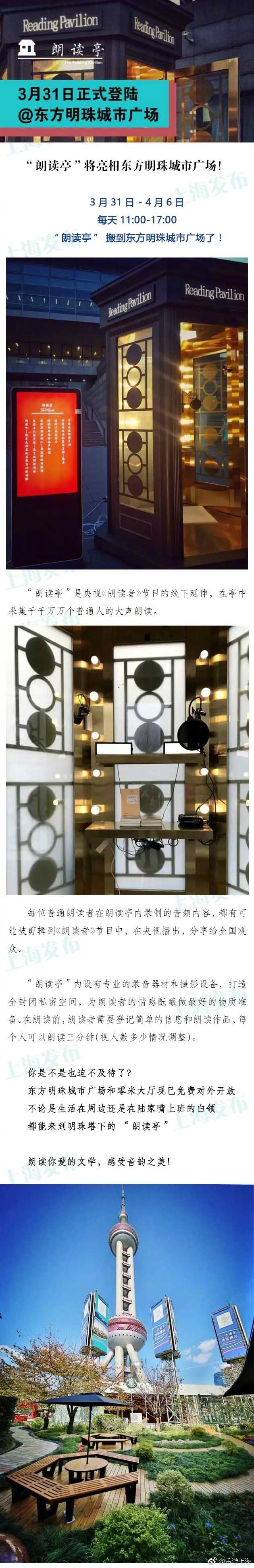 央廣網上海3月30日消息 據樂游上海發(fā)布稱,熱愛朗讀的小伙伴注意!繼徐匯濱江西岸之后,網紅“朗讀亭”又于3月31日至4月6日亮相東方明珠城市廣場,你可以在“朗讀亭”里將經典文選讀給親友或自己,感受讀書的樂趣。