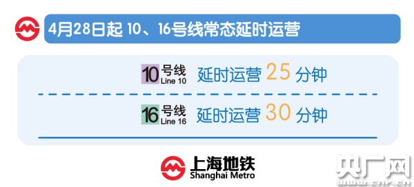 針對乘客集中反映的10、16號線末班車結(jié)束時(shí)間過早的問題,地鐵運(yùn)營方高度重視。4月28日起,10號線、16號線兩條線路全線每天都將延長運(yùn)營時(shí)間,10號線全線延時(shí)運(yùn)營25分鐘,16號線全線延時(shí)運(yùn)營30分鐘,延時(shí)運(yùn)營期間的列車運(yùn)行間隔均為10分鐘左右。