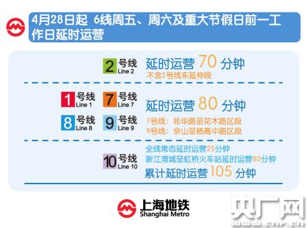 4月28日起,上海地鐵1、2、7、8、9、10號線實(shí)施周五、周六延時(shí)運(yùn)營。在延長運(yùn)營時(shí)段內(nèi),上述線路均在原末班車后開行載客列車,運(yùn)營車站覆蓋中心城區(qū)(即外環(huán)線內(nèi)),開行區(qū)段內(nèi)站站停靠;在延時(shí)運(yùn)營時(shí)段內(nèi),上述線路均可在相關(guān)站點(diǎn)進(jìn)行換乘。