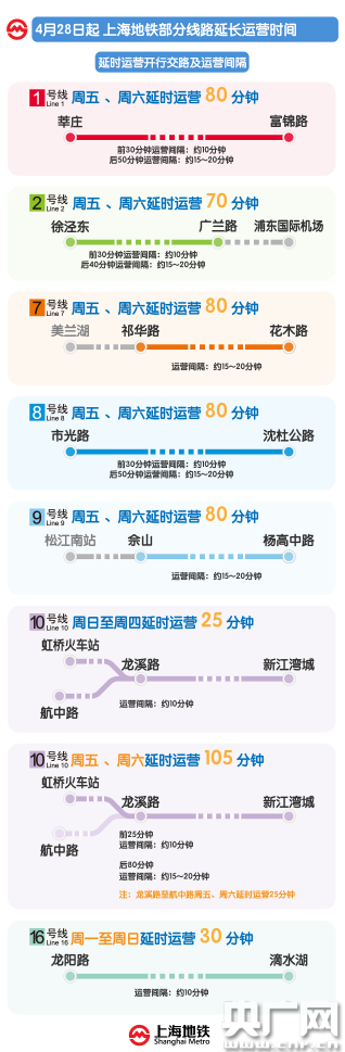 4月28日起,1、2、7、8、9、10號線六條線路逢周五、周六延時(shí)運(yùn)營,“五一”、“十一”及元旦節(jié)前最后一個(gè)工作日上述線路也將延時(shí)運(yùn)營。從2016年12月2日開始,上海地鐵1、2、8號線在周五、周六及重要節(jié)假日前最后一個(gè)工作日的常態(tài)末班車基礎(chǔ)上,已延長30分鐘運(yùn)營時(shí)間。本次延長運(yùn)營時(shí)間,一方面再次增加了1、2、8號線三線延長運(yùn)營的時(shí)間,另一方面新增了延長運(yùn)營線路,即擴(kuò)展到了7號線祁華路站-花木路站區(qū)段、9號線佘山站-楊高中路站區(qū)段、10號線虹橋火車站-新江灣城站區(qū)段。