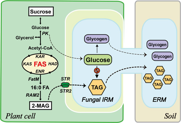 中國科學(xué)院上海植物生理生態(tài)研究所的王二濤團隊通過穩(wěn)定同位素標(biāo)定實驗,首次否定了糖是植物傳遞給菌根真菌主要碳源形式。同時,研究者采用遺傳學(xué),分子生物學(xué)及代謝生物學(xué)的手段研究發(fā)現(xiàn),植物宿主的脂肪酸合成對于叢枝菌根真菌共生是必須的,并且植物合成的脂肪酸能夠直接傳遞給菌根真菌。進一步的研究發(fā)現(xiàn)植物基因合成的一類特殊脂肪酸分子,被植物的轉(zhuǎn)運蛋白轉(zhuǎn)運給菌根真菌。該研究系統(tǒng)揭示了脂肪酸是光合作用碳源的主要傳遞形式,推翻了傳統(tǒng)認(rèn)識,對于理解生態(tài)系統(tǒng)的碳氮循環(huán)具有重要的意義。