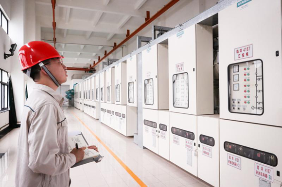 國網(wǎng)上海電力工作人員正在位于臨港的特斯拉配套變電站進(jìn)行立屏調(diào)試。
