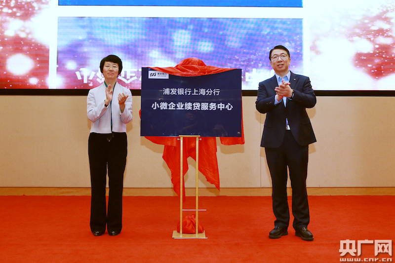 浦發銀行黨委書記鄭楊與上海金融工作局局長解冬共同為浦發銀行小微企業續貸服務中心成立揭牌(央廣網發 浦發銀行提供)