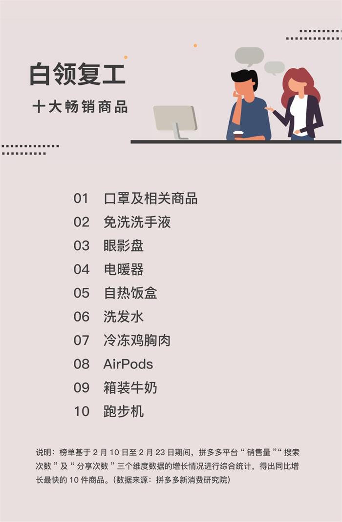 日前,拼多多對平臺消費數據尤其是三線以上復工密集城市的消費數據進行了分析,得出“白領復工10大熱銷商品”榜單。其中,既有口罩及相關衍生品,又有自熱飯盒、眼影盤等解決吃和用的商品。