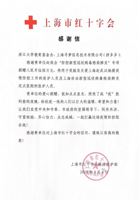 3月4日,上海市紅十字會給拼多多和浙江大學發來感謝信,感謝兩家單位為醫護工作人員帶來的500萬元專項捐贈。