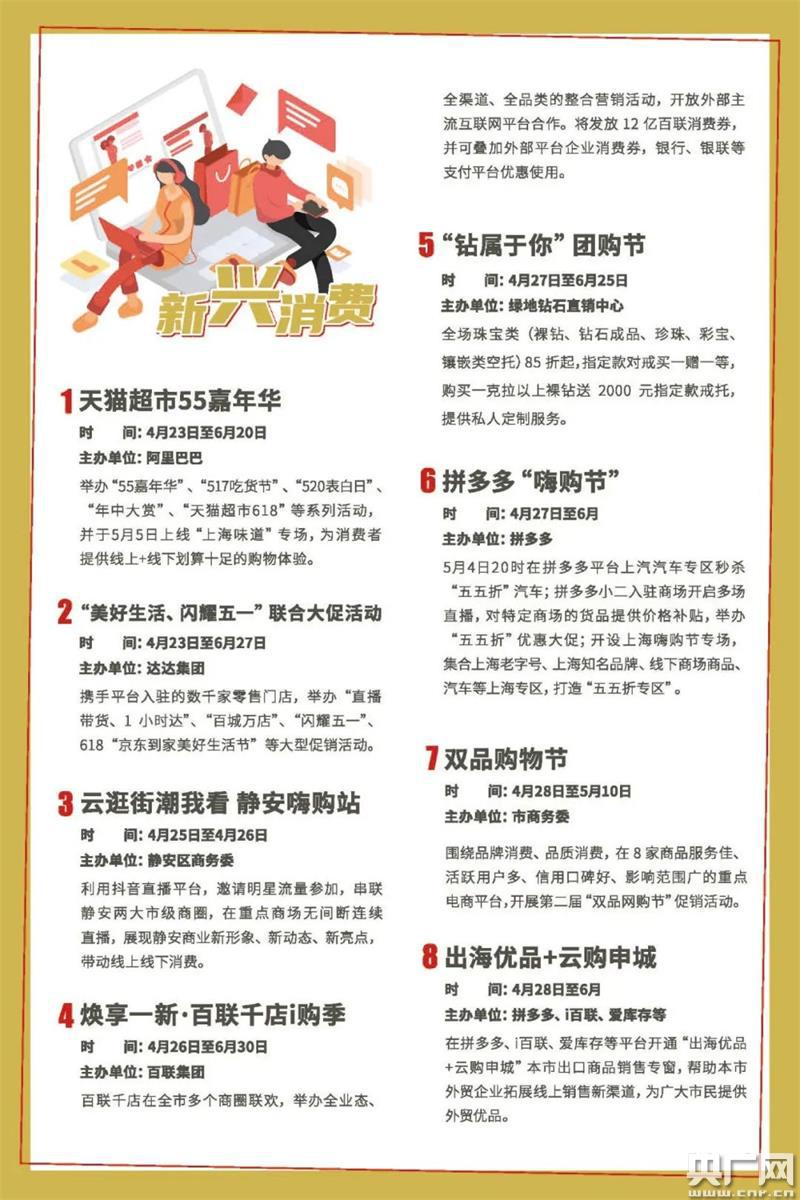 新興消費方面,將推出近30項重點活動,如阿里巴巴將打造“55聚劃算匯聚上海”專屬會場,開展打折、發放大額優惠券等讓利活動,涉及1000家本地生活品牌、42萬家淘寶天貓上海商家。