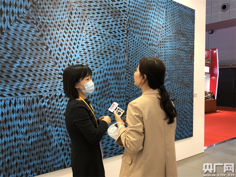 西班牙全球藝術(shù)時(shí)代(Global Artera)公司的合伙人馬科星女士接受總臺(tái)央廣記者專訪,并介紹展品(央廣網(wǎng)發(fā) 受訪者供圖)