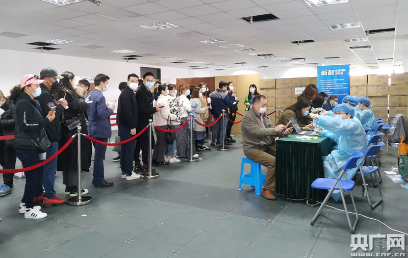 上海長寧區(qū)文廣大廈流動新冠疫苗接種點,前來接種的市民排隊進行預檢(央廣網(wǎng)記者林馥榆 攝)