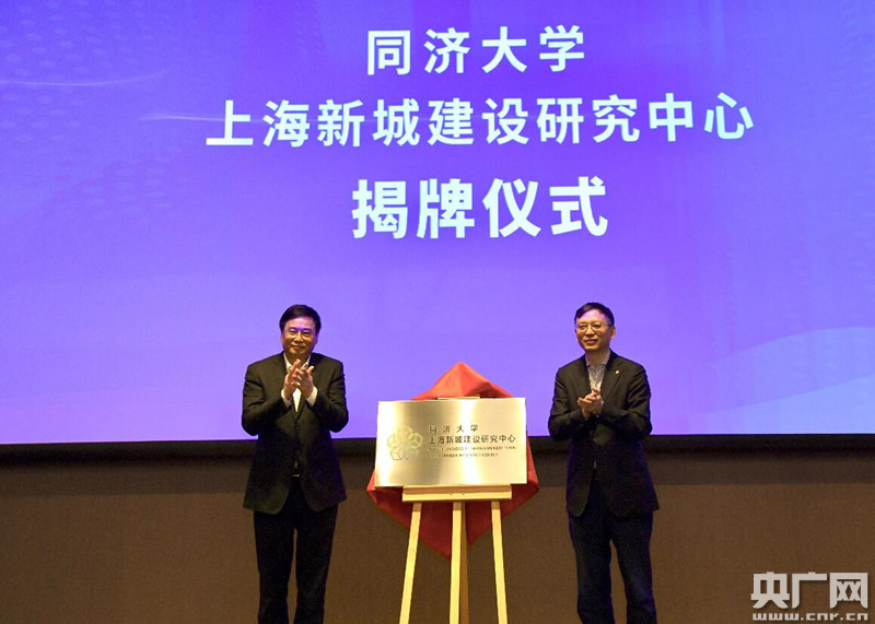 上海市副市長湯志平(左)與同濟大學黨委書記方守恩(右)共同揭牌(央廣網(wǎng)發(fā) 同濟大學供圖)