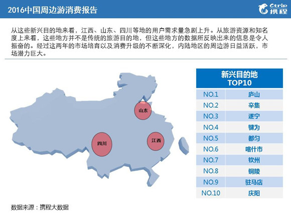 據攜程相關負責人介紹,從熱門目的地的分布可以看出,長三角、珠三角以及京津冀地區的人最愛周邊游。“鑒于周邊游的距離屬性,出發地一般不會距離目的地太遠,通常會是車程4個小時或者高鐵2個小時以內。”新興目的地,如江西、山東、四川等地的用戶需求量急劇上升。經過這兩年的市場培育以及消費升級的不斷深化,內陸地區的周邊游日益活躍,市場潛力巨大。