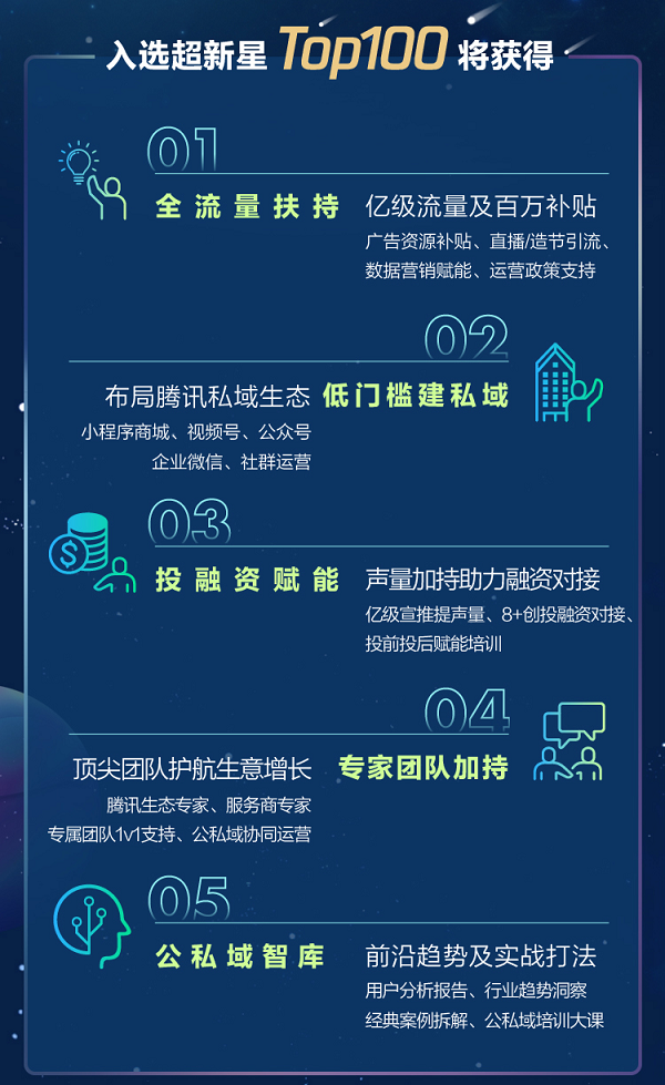 參與“域見超新星”計(jì)劃的新銳品牌,將獲得騰訊及生態(tài)伙伴共同帶來的“全流量扶持、低門檻建私域、投融資賦能、專家團(tuán)隊(duì)加持、公私域智庫”五大扶持措施,覆蓋新銳品牌在全商業(yè)生命周期中不同階段所需的能力與資源建設(shè),讓品牌快速跑通騰訊交易場(chǎng)內(nèi)的長(zhǎng)期商業(yè)鏈路,步入增長(zhǎng)正軌。