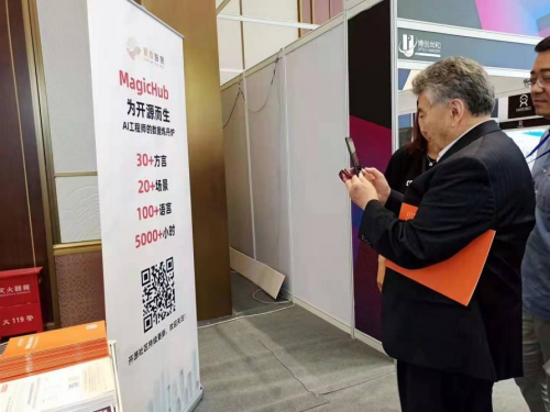 吾守爾·斯拉木參觀愛(ài)數(shù)智慧展位并關(guān)注MagicHub.io開(kāi)源社區(qū)(圖片源自:國(guó)際在線)