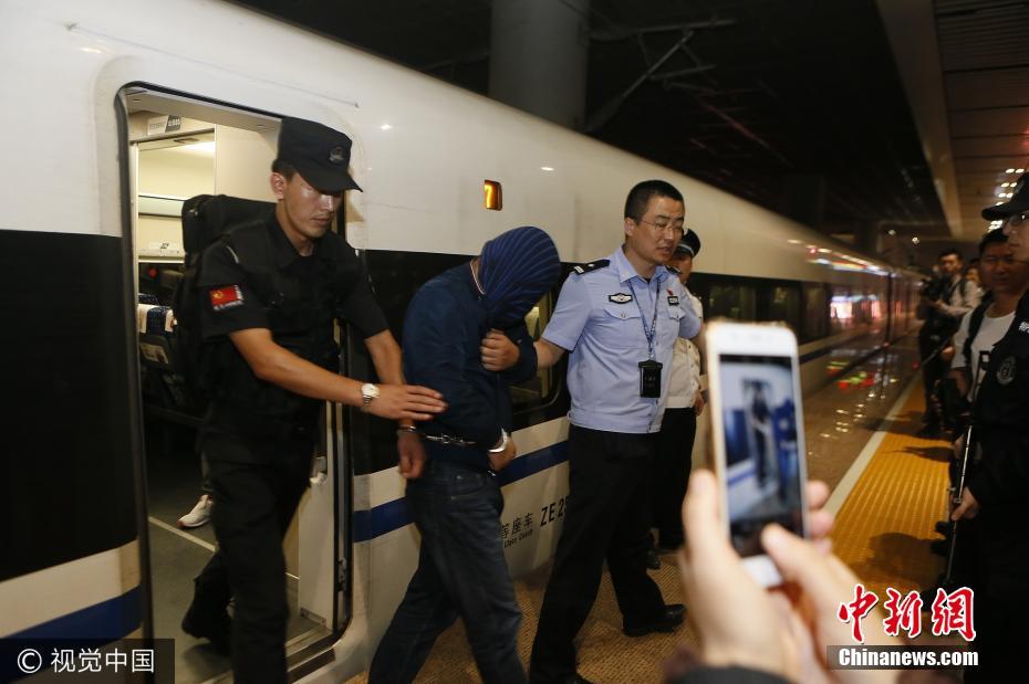9月4日晚11時許,隨著列車緩緩進站,25名犯罪嫌疑人從哈爾濱押解回西安。據該局相關負責人介紹,押解時間長達一天一夜,為防止嫌疑人自殘或脫逃,押解民警將自己和嫌疑人拷在一起。目前,這25名嫌疑人因涉嫌網絡詐騙,已被公安航天分局立案調查,目前案件還在偵辦中。張杰攝 圖片來源:視覺中國