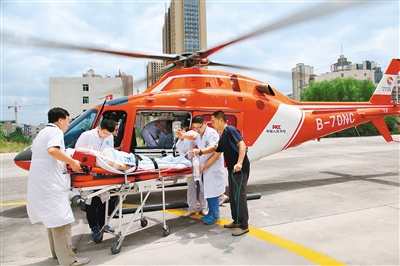 7月18日上午12時許,一架紅色救援直升機穩(wěn)穩(wěn)地降落在唐都醫(yī)院救援基地,該院醫(yī)務(wù)人員安全快速護送,將從200公里外轉(zhuǎn)運來的患者速送急診科。
