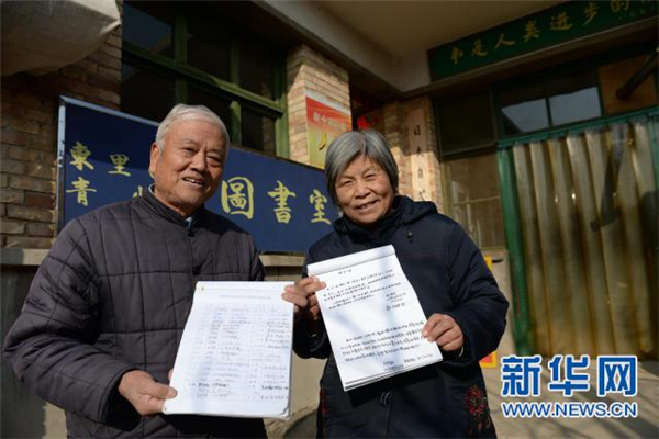 雷國平(左)、范秀蓮夫婦在家里創辦的“東里村青少年圖書館”外展示借閱登記冊和圖書捐贈記錄(12月16日攝) 新華社記者 李一博 攝