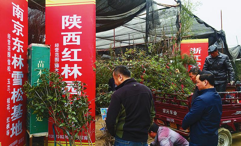 圖為客商在周至啞柏苗木花卉交易大廳大苗交易區選購苗木。