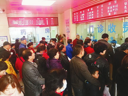 在解放軍第四五一醫(yī)院的掛號窗口前,前來就醫(yī)的群眾正在排隊。
