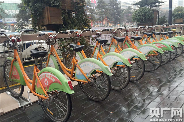 西安市小寨十字城市公共自行車停放點,公共自行車整齊停放,圖片來自大秦之聲