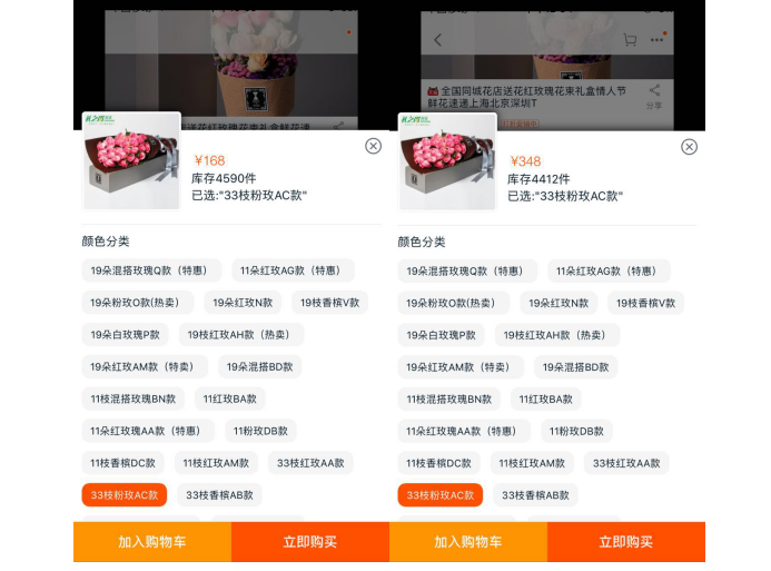 不僅實體店鋪如此,通過網(wǎng)絡(luò)訂購的玫瑰花束價格也隨著情人節(jié)的到來一路飆升。記者2月2日在淘寶一家店鋪發(fā)現(xiàn),一束33枝的帶包裝粉色玫瑰配送價為168元;2月12日,這家店的同款玫瑰價格就漲到348元一束。十天時間,價格就翻了兩番還多。