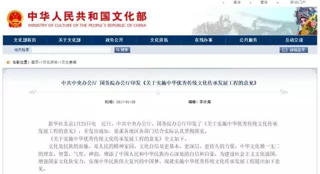 文化自信,是一個民族所有“自信”的前提和基礎。中共中央辦公廳、國務院辦公廳2月6日正式公布《關于實施中華優秀傳統文化傳承發展工程的意見》,第一次以中央文件形式專題闡述中華優秀傳統文化傳承發展工作。正如習近平總書記所強調的,“中華文化延續著我們國家和民族的精神血脈,既需要薪火相傳、代代守護,也需要與時俱進、推陳出新。”