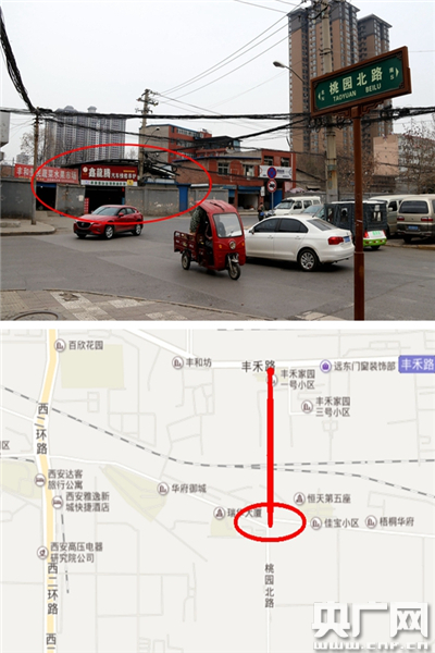 紅圈標記處為西安市區桃園北路“斷頭路”(丁字口)和計劃拆遷的房屋,圖片來自大秦之聲
