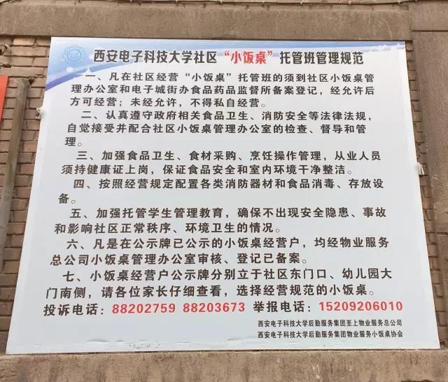 西安電子科技大學社區內托管班招牌上附有“小飯桌登記備案戶”牌匾圖片 圖片來自大秦之聲