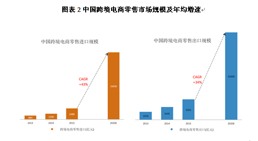 2015年,中國跨境電商零售交易額達到7512億元,同比增長69%。其中,跨境電商零售出口額5032億元,同比增長60%;跨境電商零售進口額2480億元,同比增長92%。預計到2020年,中國跨境電商零售交易額將超過3.6萬億元,在2015-2020年區間,年均增幅約37%。根據測算,2020年跨境電商零售出口額將達到約2.16萬億元,年均增幅34%;2020年跨境電商零售進口額約1.5萬億元,年均增幅約43%。