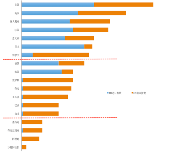 根據阿里巴巴跨境電子商務大數據(涉及B2B出口、B2C出口和B2C進口)編制的ECI指數(E-Commerce Connectivity Index between China and Major Economies, 中國與主要經濟體跨境電商連接指數)來看,在二十國集團(G20)國家中,2015年中國與G20其他國家的跨境電商連接指數排名是:美國、英國、澳大利亞、法國、意大利、日本、加拿大、德國、韓國、俄羅斯、印度、土耳其、巴西、南非、墨西哥、印度尼西亞、阿根廷、沙特阿拉伯(暫不包括歐盟)。