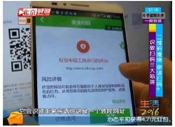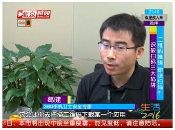 提到二維碼,相信絕大多數人都不會感到陌生。移動支付、社交軟件溝通、打折優惠、電子票券等各種各樣的二維碼,現已覆蓋了我們生活的方方面面。與此同時,二維碼所帶來的風險也日益增多。近日,北京電視臺播出的《生活2016》欄目中,來自360公司的安全專家現場便揭秘了常見的二維碼陷阱和識別技巧。