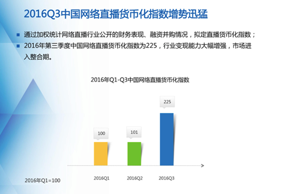 值得注意的是,在今年第三季度,我國網絡直播行業的變現能力出現大幅增強。《中國網絡直播行業景氣指數報告》顯示,2016年第三季度中國網絡直播貨幣化指數為225,環比增長122.8%。中國信通院研究院政策經濟研究所主任何偉表示,“當前,我國互聯網直播的內容和形式呈現出多元化探索的特征,網絡直播與各行業業態之間的融合加深,直播+爆發出強大的生命力,這種融合不僅是我國產業融合創新的重要體現,也是直播平臺未來拓寬變現模式的主要方向。”