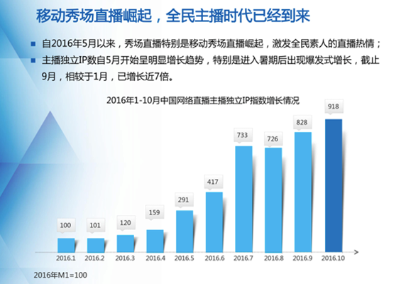 從主播層面看,自2016年5月以來,秀場直播特別是移動秀場直播崛起,激發全民素人的直播熱情。主播獨立IP數自5月開始呈明顯增長趨勢,特別是進入暑期后出現爆發式增長,截止9月,相較于1月,已增長近7倍。主播同時在線指數在5月迅猛爆發,6月市場稍趨冷靜,隨之繼續增長。
