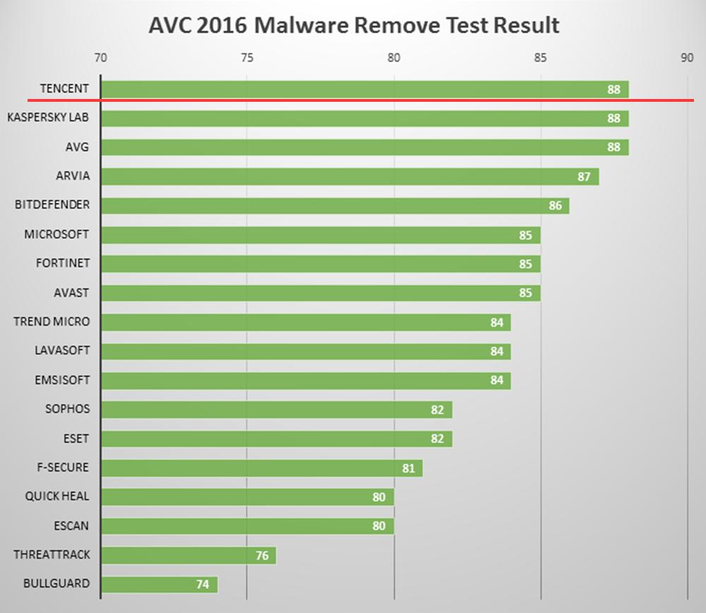 同時,值得一提的是,清除測試系騰訊電腦管家(英文版)2016年首次參測的項目,在和卡巴斯基、AVG等國際知名殺軟的同場競技中,騰訊電腦管家(英文版)憑借自研殺毒引擎TAV,以出色的清除能力取得最高分,與卡巴斯基、AVG并列排名世界第一,榮獲“A+”最高評級。觀察清除測試結(jié)果還可以發(fā)現(xiàn),在18款參測的殺毒軟件中,騰訊電腦管家是唯一一個登榜的國產(chǎn)殺軟品牌,這代表著國產(chǎn)殺軟在惡意文件清除能力上已經(jīng)到達(dá)了世界領(lǐng)先水平。