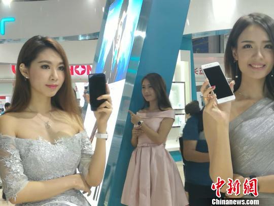 資料圖:“2016年天翼智能終端交易博覽會”上模特在展示智能手機。唐貴江攝