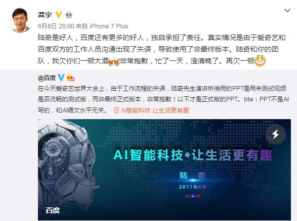 6月9日消息,愛奇藝創始人、CEO龔宇在微博上回應了2017愛奇藝世界大會開幕式主題演講中陸奇的“PPT烏龍事件”,稱百度獨自承擔了責任,而這個錯誤是因為愛奇藝和百度雙方溝通出現失誤。龔宇將陸奇稱之為“好人”,并表示因為失誤和回應晚了,要請陸奇和他的團隊兩頓大酒。