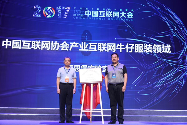 中國(guó)互聯(lián)網(wǎng)協(xié)會(huì)秘書長(zhǎng)盧衛(wèi)與山東海思堡服裝服飾集團(tuán)股份有限公司董事長(zhǎng)馬學(xué)強(qiáng)為“產(chǎn)業(yè)互聯(lián)網(wǎng)牛仔服裝領(lǐng)域海思堡實(shí)驗(yàn)室”揭牌