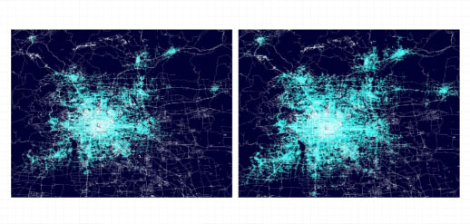 將訂單還原至具體地點(上圖),不難看出,拼車和非拼車的訂單分布大體相似,但前者更多聚集在城市中心區域。在全國拼車節約里程排行榜上,北京僅次于成都位列第二,同樣上榜的還有天津、深圳、廣州等城市。