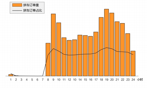 移動互聯網的廣泛應用,使得像滴滴出行這樣的平臺上拼車比例大幅提高。如上圖所示,拼車行為具有明顯的早晚高峰趨勢,而且早晚高峰拼車訂單百分比也略高于其他時間段。可見,在出行需求較旺盛時,人們更傾向于選擇拼車。