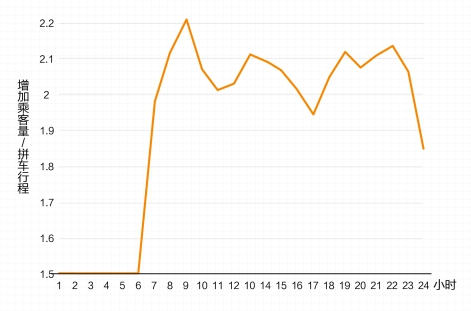 拼車條件下,單位行程載客量是訂單數和平均訂單載客量相乘的結果。打個比方,在一次拼車行程中共有3個訂單,每個訂單都有1位乘客,那么這趟行程就比相同條件下的非拼車行程多載2位客人。