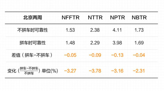 通過對比隨機兩周內有拼車和無拼車情況下的北京交通可靠性指標,報告發現拼車可以讓NPTR(網絡規劃行程時間率)值減少0.13,NBTR(網絡緩沖行程時間率)值減少0.04。前者意味著在擁堵時拼車讓北京居民平均每千米節省7.8秒,后者則意味著,拼車讓北京居民平均每千米可以少預留2.4秒的出行時間。