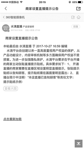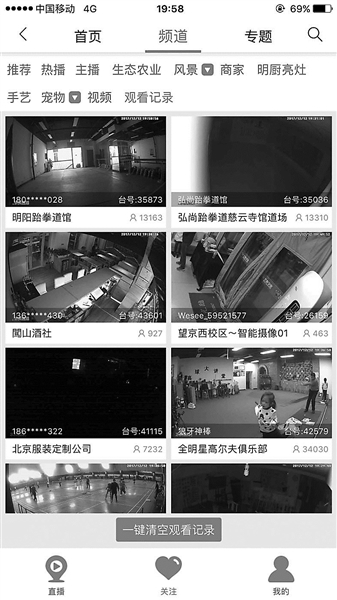 北青報記者在陳菲菲拍攝的視頻中看到,直播平臺平均每天觀看人數達到700多萬。點開360攝像機的軟件,其中一個板塊叫做水滴直播,在上面能夠看到形形色色的監控畫面。光是北京,正在直播的就有657個。文中提到,直播平臺要求用戶張貼直播告示,《商家設置直播提示公告》要求在平臺開播的商家需要在直播區域設置明顯直播提示以告知顧客,提示貼紙需要在畫面明顯露出,或者在直播臺簡介中注明:“本店直播已告知顧客”類似文字,但調查者發現“商家不聽話,極少有張貼”。