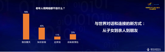 作為國內(nèi)領(lǐng)先的互聯(lián)網(wǎng)增值服務(wù)商,騰訊依托豐富的社交大數(shù)據(jù)積累,與央視聯(lián)合發(fā)布《互聯(lián)網(wǎng)與中老年人的社交和社會參與》大數(shù)據(jù)報告。報告指出,互聯(lián)網(wǎng)社交正在向縱深發(fā)展,老年人逐漸成為微信增長主力,2017年微信數(shù)據(jù)報告顯示,55歲以上老年用戶達到5500萬,互聯(lián)網(wǎng)已經(jīng)成為老年人與世界對話和連接的新方式。