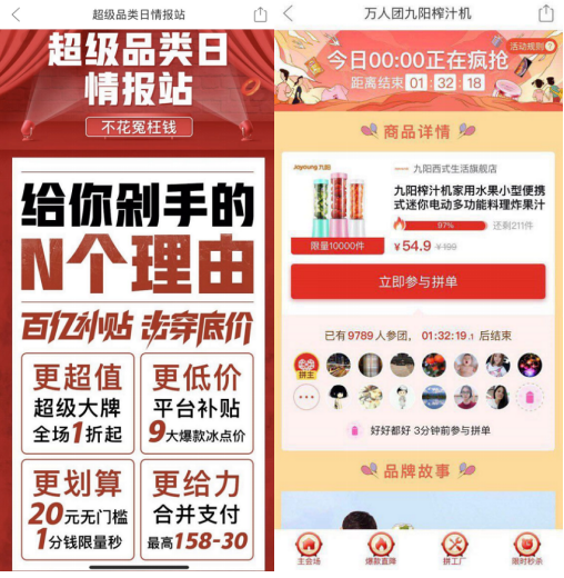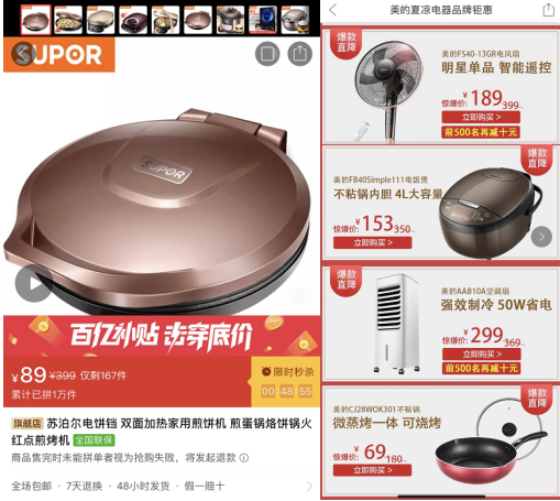 活動(dòng)數(shù)據(jù)顯示,家電數(shù)碼、日化、母嬰類產(chǎn)品擁有最高的達(dá)成率:190元的美的電壓力鍋、89元的蘇泊爾煎餅機(jī)、54.9元的九陽榨汁機(jī)、259.9元的格蘭仕微波爐等家電系列標(biāo)品,成為截至目前的明星產(chǎn)品。汰漬、多芬、七度空間等個(gè)護(hù)洗護(hù)類高頻消費(fèi)品,在平均成團(tuán)時(shí)長上占據(jù)明顯優(yōu)勢;“上海老字號(hào)品牌特惠專場“則在整體成交轉(zhuǎn)化率上維持領(lǐng)先。