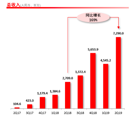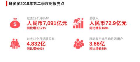 北京時間8月21日,新電商平臺拼多多(NASDAQ:PDD)發布了2019年第二季度財報。財報顯示,截至2019年6月30日的12個月期間,平臺GMV達7091億元,較去年同期的2621億元同比增長171%;二季度,拼多多實現營收72.90億元,較去年同期的27.09億元同比增長169%,較今年一季度的45.452億元,環比增長60%。