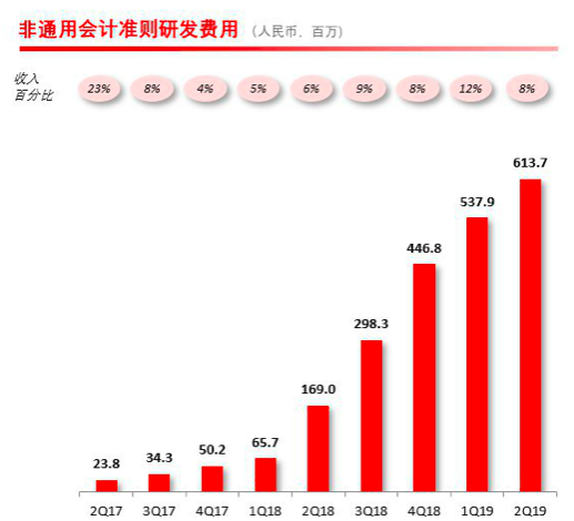 ▲2019年第二季度,拼多多研發費用攀升至8.037億元,同比增長332%。平臺研發費用占收入比為11%,高于行業平均水平。