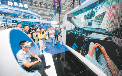 2019中國國際智能產業博覽會上,在東贏恒康控股集團展臺,一名參觀者通過VR體驗無人駕駛汽車自動入庫停車。